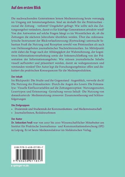 Die nachwachsenden Generationen lernen Mediennutzung heute vorrangig im Umgang mit Internetangeboten. Sind sie deshalb für die Printmedien - zumal die Zeitung - verloren? Umgekehrt gefragt: Wie sollte sich das Zeitungsangebot verändern, damit es für künftige Generationen attraktiv wird? Von den Antworten auf solche Fragen hängt es im Wesentlichen ab, ob die Zeitungen die nächsten Jahrzehnte überleben werden. Über das mikroanalytische Instrument der Blickverlaufsmessung (Eyetracking) untersucht Sebastian Feuß die Nutzung und Rezeption sowohl von Printmedien als auch von Onlineangeboten journalistischer Nachrichtenmedien. Im Mittelpunkt stand dabei die Frage nach der Abhängigkeit der Wahrnehmung, der kognitiven Informationsverarbeitung sowie der Seitenerschließung von der Präsentation der Informationsangebote: Wie müssen journalistische Inhalte visuell aufbereitet und präsentiert werden, damit sie wahrgenommen und verstanden werden? Der Autor legt die Forschungsergebnisse offen unddiskutiert die praktischen Konsequenzen für die Medienproduktion.