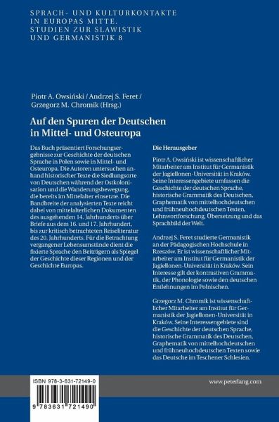Piotr A. Owsi¿ski ist wissenschaftlicher Mitarbeiter am Institut für Germanistik der Jagiellonen-Universität in Kraków. Seine Interessengebiete umfassen die Geschichte der deutschen Sprache, historische Grammatik des Deutschen, Graphematik von mittelhochdeutschen und frühneuhochdeutschen Texten, Lehnwortforschung, Übersetzung und das Sprachbild der Welt. Andrzej S. Feret studierte Germanistik an der Pädagogischen Hochschule in Rzeszów. Er ist wissenschaftlicher Mitarbeiter am Institut für Germanistik der Jagiellonen-Universität in Kraków. Sein Interesse gilt der kontrastiven Grammatik, der Phonologie sowie den deutschen Entlehnungen im Polnischen. Grzegorz M. Chromik ist wissenschaftlicher Mitarbeiter am Institut für Germanistik der Jagiellonen-Universität in Kraków. Seine Interessengebiete sind die Geschichte der deutschen Sprache, historische Grammatik des Deutschen, Graphematik von mittelhochdeutschen und frühneuhochdeutschen Texten sowie das Deutsche im Teschener Schlesien.