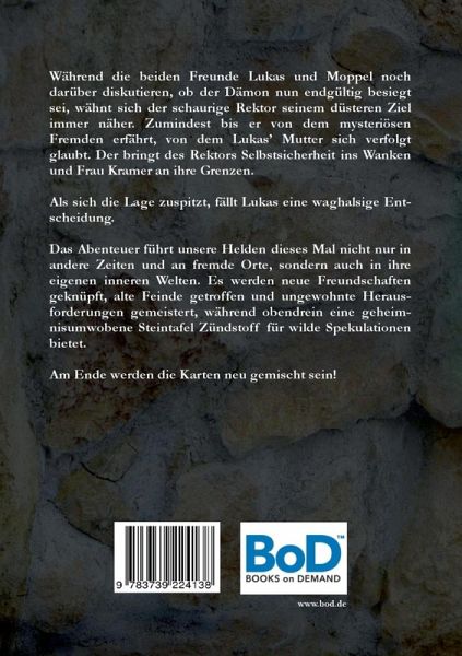 "Schatten der Vergangenheit" ist der dritte Band der Reihe "Auf den Spuren der Macht", in der es nicht nur um spannende Abenteuer, mystische Welten, Zauberei und Zeitreisen geht, sondern auch um Freundschaft, Vertrauen und Mut und ganz handfeste Situationen im Hier und Jetzt, die es ebenfalls zu meistern gilt.Der Protagonist der Romanreihe ist Lukas, ein schüchterner und überbehüteter Junge, der mit der Welt des Magischen in Berührung kommt. Mit seinem besten Freund Moppel besteht er Abenteuer in anderen Zeiten und Dimensionen, in deren Verlauf die beiden neue Erkenntnisse und Einblicke erhalten, die sie sich in ihren kühnsten Träumen nicht hätten ausmalen können. Ihre Welt wird auf den Kopf gestellt. Nichts ist mehr, wie es war für die Freunde, und Lukas wird bewusst, dass er sich seinem Schicksal nicht entziehen kann, denn ein mächtiger Widersacher steht im Dienst eines schrecklichen Dämons und versucht, der dunklen Seite zur Macht zu verhelfen.Lukas und Moppel sind jedoch nicht alleine. Sie werden von Helfern und Freunden aus dieser und anderen Welten begleitet. Zum Inhalt von Band 3:Während die beiden Freunde noch darüber diskutieren, ob der Dämon nun endgültig besiegt sei, wähnt sich der schaurige Rektor seinem düsteren Ziel immer näher. Zumindest bis er von dem mysteriösen Fremden erfährt, von dem Lukas' Mutter sich verfolgt glaubt. Der bringt des Rektors Selbstsicherheit ins Wanken und Frau Kramer an ihre Grenzen.Als die Lage sich zuspitzt, fällt Lukas eine waghalsige Entscheidung.Das Abenteuer führt unsere Helden dieses Mal nicht nur in andere Zeiten und an fremde Orte, sondern auch in ihre eigenen inneren Welten. Es werden neue Freundschaften geknüpft, alte Feinde getroffen und ungewohnte Herausforderungen gemeistert, und obendrein bietet eine geheimnisumwobene Steintafel Zündstoff für wilde Spekulationen.Am Ende werden die Karten neu gemischt sein!