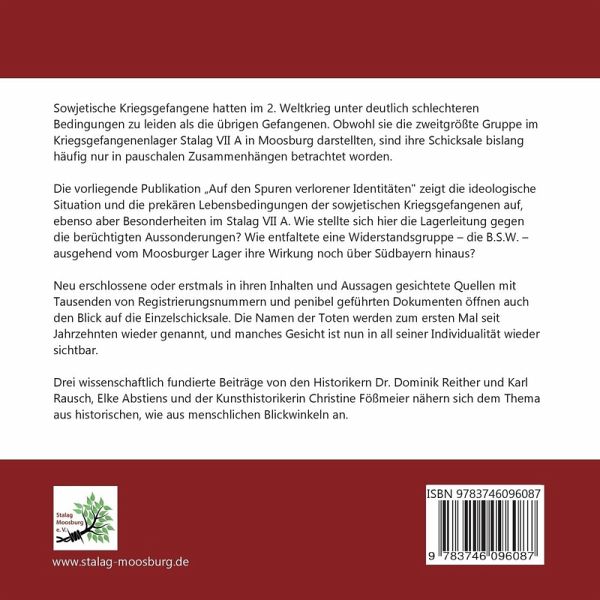 Sowjetische Kriegsgefangene hatten im 2. Weltkrieg unter deutlich schlechteren Bedingungen zu leiden als die übrigen Gefangenen. Obwohl sie die zweitgrößte Gruppe im Kriegsgefangenenlager Stalag VII A in Moosburg darstellten, sind ihre Schicksale bislang häufig nur in pauschalen Zusammenhängen betrachtet worden. Die vorliegende Publikation -Auf den Spuren verlorener Identitäten- zeigt die ideologische Situation und die prekären Lebensbedingungen der sowjetischen Kriegsgefangenen auf, ebenso aber Besonderheiten im Stalag VII A. Wie stellte sich hier die Lagerleitung gegen die berüchtigten Aussonderungen? Wie entfaltete eine Widerstandsgruppe - die B.S.W. - ausgehend vom Moosburger Lager ihre Wirkung noch über Südbayern hinaus?Neu erschlossene oder erstmals in ihren Inhalten und Aussagen gesichtete Quellen mit tausenden von Registrierungsnummern und penibel geführten Dokumenten öffnen auch den Blick auf die Einzelschicksale. Die Namen der Toten werden zum ersten Mal seit Jahrzehnten wieder genannt, und manches Gesicht ist nun in all seiner Individualität wieder sichtbar.Drei wissenschaftlich fundierte Beiträge von den Historikern Dr. Dominik Reither und Karl Rausch, Elke Abstiens und der Kunsthistorikerin Christine Fößmeier nähern sich dem Thema aus historischen, wie aus menschlichen Blickwinkeln an.