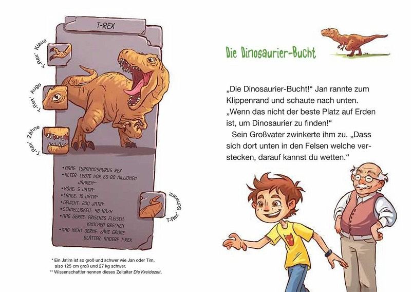 Doch nicht alle Dinos sind friedliche Pflanzenfresser, wie die beiden schon bald feststellen. Denn ein gefährlicher Tyrannosaurus Rex jagt Jan und Tim quer durch den Dschungel!