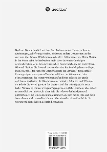 Plötzlich waren die alten Bilder wieder da: Meine Mutter in der Küche beim Kuchenbacken; mein Vater in seiner schneidigen Arbeitsdienstuniform; die amerikanischen Bomberverbände am wolkenlosen Himmel; die über die an der Wohnzimmertür befestigten Europakarte wandernden Stecknadeln; der erste Neger meines Lebens; der russische Offizier Nikolai; unsere Kühe; unser Pferd Hansi; die Schweine, die nicht fürs Reiten geeignet waren; mein Vater beim Mähen der Wiesen und beim Schnapsbrennen; das Rübenverziehen auf endlosen Feldern; der große Apfelbaum im Garten; die Räucherkammer mit den Schinken und Würsten; die Schule; die erste Zigarette; das Internat und das Wichtigste, die erste Liebe. Als wäre es erst vor wenigen Tagen gewesen. Dabei liegt allesschon so weit zurück, in einer Zeit, die sich von der heutigen total unterscheidet, mit Umständen und Zuständen, die sich meine Frau und mein Sohn absolut nicht vorstellen können. Aber sie sollen einen Einblick in die vergangene Zeit erhalten, deshalb diese Zeilen.