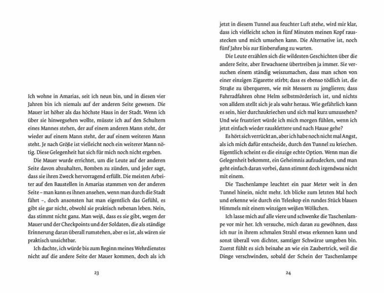 «Ein packender politischer Jugendroman (...) unterhaltsam, berührend und neben all dem auch sprachlich ein Genuss.» (Deutschlandfunk)Als Joshua einen Tunnel findet, der unter der schwerbewachten Mauer seiner Siedlung hindurchführt, kann er der Versuchung einfach nicht widerstehen: Nur ganz kurz möchte er einen Blick auf die andere Seite werfen - dorthin, wo nach den Worten seines Stiefvaters der Feind lebt, der Tag für Tag darauf lauert, die Siedler zu töten. Doch von dem Moment an, als Joshua auf der anderen Seite den Kopf aus dem Tunnel steckt, ist sein Leben nicht mehr, wie es vorher war.Nominiert für den Deutschen Jugendliteraturpreis 2015