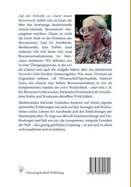 Auf der Schwelle zu einem neuen Bewusstsein richtet sich an Leser, die über das heutzutage dominierende mental-rationale Bewusstsein hinausgehen möchten. Dieses ist nicht die letzte Stufe in der Evolution des Bewusstseins. Laut Sri Aurobindo, Medhananda, Jean Gebser (und anderen) will sich heute eine neue Bewusstseinsdimension im Menschen realisieren: Wir befinden uns in einer Übergangsepoche, in der wir die Chance und auch die Aufgabe haben, über das dualistische Entweder-Oder-Denken hinauszugehen. Was unser Verstand als Gegensätze auffasst, z.B. Wissenschaft/Spiritualität, Materie/Geist, das erkennt eine höhere Bewusstseinsebene in uns als komplementäre Aspekte der einen Wirklichkeit - oder (wie z. B. bei Bewusstes/Unbewusstes, Rationales/Irrationales) als verschiedene Stufen und Strukturen derselben Wirklichkeit. Medhanandas klärende Gedanken basieren auf seinen eigenen spirituellen Erfahrungen wie auch auf den Aussagen und Realisationen seines Lehrers Sri Aurobindo und den Entdeckungen der Quantenphysiker. Er zeigt uns überall Zusammenhänge und Verbindungen und lädt uns ein, die transparente, integrale Ganzheit der Welt - den geistig-göttlichen Ursprung - in uns und in allem wahrzunehmen und zu erfahren.