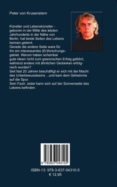 Als Künstler und Lebenskünstler hat der Autor beide Seiten des Lebens kennengelernt. Gerade die andere Seite, die Schattenseite, hat ihn sehr beschäftigt. Warum haben scheinbar gute Ideen nicht zum gewünschten Erfolg geführt? Seit annähernd 20 Jahren beschäftigt er sich mit der Macht des Unterbewusstseins. Sein Fazit: JEDER kann auf der Sonnenseite des Lebens stehen. Wie es geht, wird hier ausführlich beschrieben.