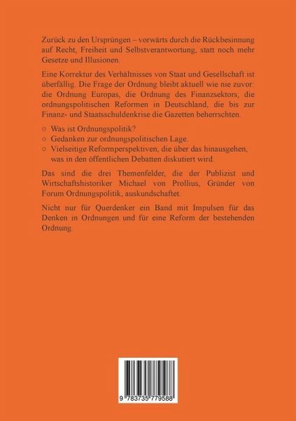 Zurück zu den Ursprüngen - vorwärts durch die Rückbesinnung auf Recht, Freiheit und Selbstverantwortung, statt noch mehr Gesetze und Illusionen. Eine Korrektur des Verhältnisses von Staat und Gesellschaft ist überfällig. Die Frage der Ordnung bleibt aktuell wie nie zuvor: die Ordnung Europas, die Ordnung des Finanzsektors, die ordnungspolitischen Reformen in Deutschland, die bis zur Finanz- und Staatsschuldenkrise die Gazetten beherrschten.Was ist Ordnungspolitik? Gedanken zur ordnungspolitischen Lage. Vielseitige Reformperspektiven, die über das hinausgehen, was in den öffentlichen Debatten diskutiert wird. Das sind die drei Themenfelder, die der Publizist und Wirtschaftshistoriker Michael von Prollius, Gründer von Forum Ordnungspolitik, auskundschaftet. Nicht nur für Querdenker ein Band mit Impulsen für das Denken in Ordnungen und für eine Reform der bestehenden Ordnung.