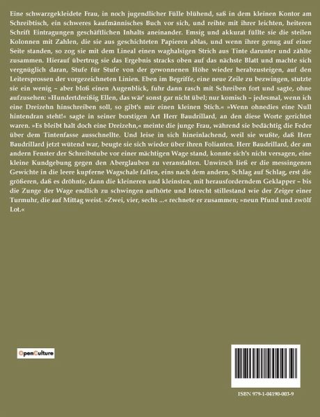 Eine schwarzgekleidete Frau, in noch jugendlicher Fülle blühend, saß in dem kleinen Kontor am Schreibtisch, ein schweres kaufmännisches Buch vor sich, und reihte mit ihrer leichten, heiteren Schrift Eintragungen geschäftlichen Inhalts aneinander. Emsig und akkurat füllte sie die steilen Kolonnen mit Zahlen, die sie aus geschichteten Papieren ablas, und wenn ihrer genug auf einer Seite standen, so zog sie mit dem Lineal einen waghalsigen Strich aus Tinte darunter und zählte zusammen. Hierauf übertrug sie das Ergebnis stracks oben auf das nächste Blatt und machte sich vergnüglich daran, Stufe für Stufe von der gewonnenen Höhe wieder herabzusteigen, auf den Leitersprossen der vorgezeichneten Linien. Eben im Begriffe, eine neue Zeile zu bezwingen, stutzte sie ein wenig ¿ aber bloß einen Augenblick, fuhr dann rasch mit Schreiben fort und sagte, ohne aufzusehen: »Hundertdreißig Ellen, das wär' sonst gar nicht übel; nur komisch ¿ jedesmal, wenn ich eine Dreizehn hinschreiben soll, so gibt's mir einen kleinen Stich.« »Wenn ohnedies eine Null hintendran steht!« sagte in seiner borstigen Art Herr Baudrillard, an den diese Worte gerichtet waren. »Es bleibt halt doch eine Dreizehn,« meinte die junge Frau, während sie bedächtig die Feder über dem Tintenfasse ausschnellte. Und leise in sich hineinlachend, weil sie wußte, daß Herr Baudrillard jetzt wütend war, beugte sie sich wieder über ihren Folianten. Herr Baudrillard, der am andern Fenster der Schreibstube vor einer mächtigen Wage stand, konnte sich's nicht versagen, eine kleine Kundgebung gegen den Aberglauben zu veranstalten. Unwirsch ließ er die messingenen Gewichte in die leere kupferne Wagschale fallen, eins nach dem andern, Schlag auf Schlag, erst die größeren, daß es dröhnte, dann die kleineren und kleinsten, mit herausforderndem Geklapper ¿ bis die Zunge der Wage endlich zu schwingen aufhörte und lotrecht stillestand wie der Zeiger einer Turmuhr, die auf Mittag weist. »Zwei, vier, sechs ...« rechnete er zusammen; »neun Pfund und zwölf Lot.«