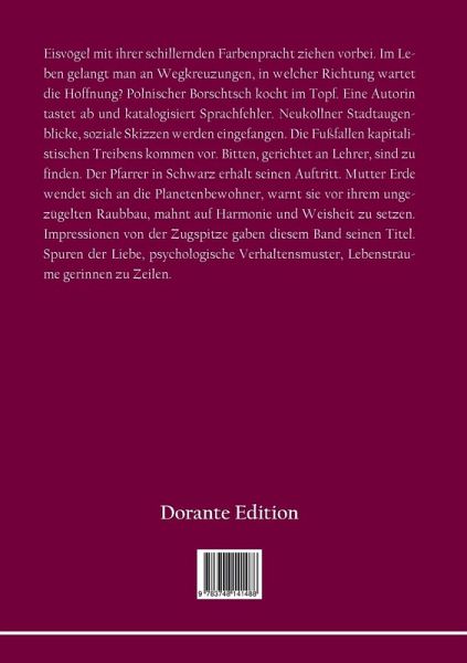 Eisvögel mit ihrer schillernden Farbenpracht ziehen vorbei. Im Leben gelangt man an Wegkreuzungen, in welcher Richtung wartet die Hoffnung? Polnischer Borschtsch kocht im Topf. Eine Autorin tastet ab und katalogisiert Sprachfehler. Neuköllner Stadtaugenblicke, soziale Skizzen werden eingefangen. Die Fußfallen kapitalistischen Treibens kommen vor. Bitten, gerichtet an Lehrer, sind zu finden. Der Pfarrer in Schwarz erhält seinen Auftritt. Mutter Erde wendet sich an die Planetenbewohner, warnt sie vor ihrem ungezügelten Raubbau, mahnt auf Harmonie und Weisheit zu setzen. Impressionen von der Zugspitze gaben diesem Band seinen Titel. Spuren der Liebe, psychologische Verhaltensmuster, Lebensträume gerinnen zu Zeilen.