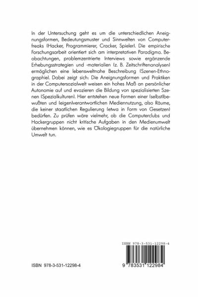 In dieser Untersuchung geht es um die unterschiedlichen Aneignungsformen, Bedeutungsmuster und Sinnwelten von Computerfreaks (Hacker, Programmierer, Cracker, Spieler). Die empirische Forschungsarbeit orientiert sich am interpretativen Paradigma. Beobachtungen, problemzentrierte Interviews sowie ergänzende Erhebungsstrategien und -materialien (z.B. Zeitschriftenanalysen) ermöglichen eine lebensweltnahe Beschreibung (Szenen-Ethnographie). Dabei zeigt sich: Die Aneignungsformen und Praktiken in der Computersozialwelt weisen ein hohes Maß an persönlicher Autonomie auf und evozieren die Bildung von spezialisierten Szenen (Spezialkulturen). Hier entstehen neue Formen einer (selbst)bewußten und (eigen)verantwortlichen Mediennutzung, also Räume, die keiner staatlichen Regulierung (etwa in Form von Gesetzen) bedürfen. Zu prüfen wäre vielmehr,ob die Computerclubs und Hackergruppen nicht kritische Aufgabenin der Medienumwelt übernehmen können, wie es Ökologiegruppen für die natürliche Umwelt tun.