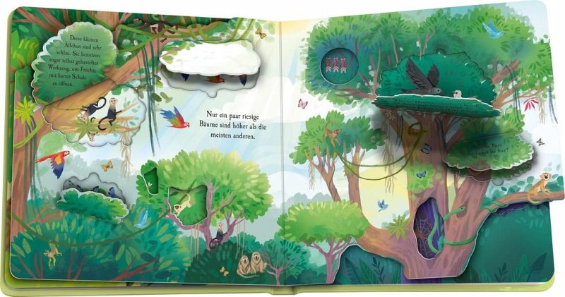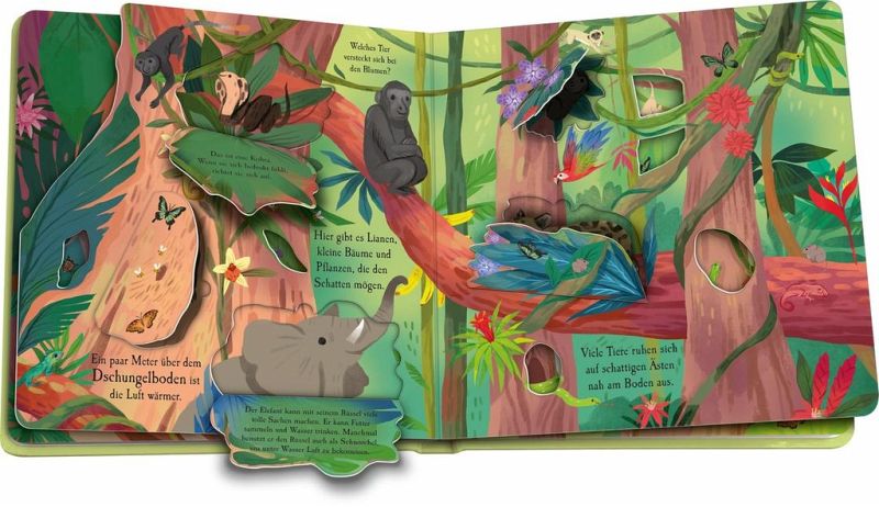 Komm mit auf große Entdeckungstour durch den farbenfrohen Dschungel. Erkunde die verschiedenen Baumschichten und begegne dabei den unterschiedlichsten Tieren.