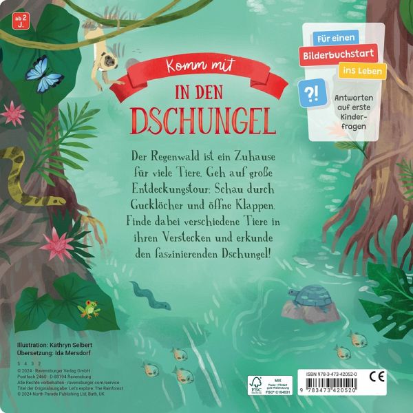 Dieses Buch bringt den Regenwald direkt ins Kinderzimmer und begeistert Kinder genauso wie Erwachsene! Begleite die Tiere des Dschungels auf einem Spaziergang und entdecke, wie sich der Regenwald über den Tag hinweg bis tief in die Nacht hinein verändert! Lerne erstes Sachwissen, erkunde Baumhöhlen und Verstecke hoch oben in den Baumkronen. Neben zahlreichen Klappen gibt es formgestanzte Seiten und viele Gucklöcher, die einen Blick auf die nächste Seite erlauben. Werde zum Dschungelexperten!