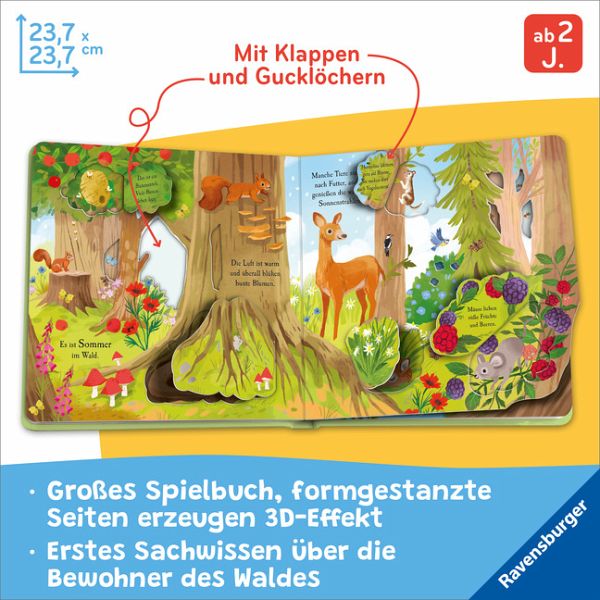 Dieses Buch bringt den Wald direkt ins Kinderzimmer und begeistert Kinder genauso wie Erwachsene! Begleite die Waldtiere auf einem Spaziergang und entdecke, wie sich der Wald über das Jahr hinweg verändert! Lerne erstes Sachwissen, erkunde Baumhöhlen und Verstecke hinter Büschen. Neben zahlreichen Klappen gibt es formgestanzte Seiten und viele Gucklöcher, die einen Blick auf die nächste Seite erlauben. Werde zum Waldexperten!