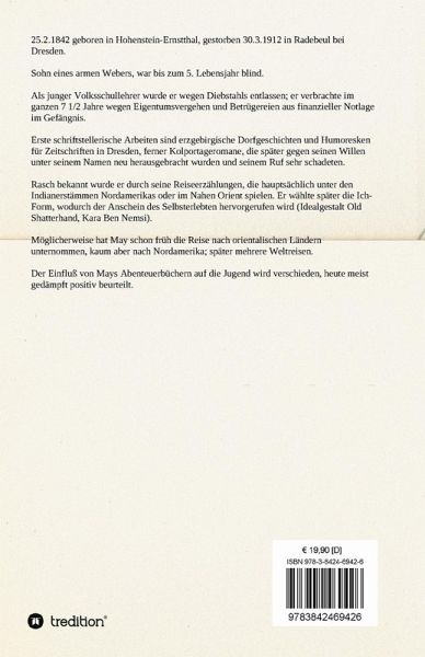 Karl May (1842-1912) war das fünfte von 14 Kindern einer armen Weberfamilie aus Ernstthal/Sachsen. Vom Studium am Lehrerseminar wurde er zunächst ausgeschlossen, nachdem er Kerzenreste unterschlagen hatte. Später konnte er die Ausbildung fortsetzen, arbeitete nur 14 Tage in seinem Beruf, bevor er wieder des Diebstahls bezichtigt und von der Liste der Kandidaten gestrichen wurde. Wegen Diebstahls, Betrugs und Hochstapelei wurde er in den Jahren darauf immer wieder verhaftet und monatelang festgesetzt. Die Jahre zwischen 1870 und 1874 verbrachte er im Zuchthaus Waldheim. Erst viele Jahre nach dem Erscheinen des akribisch recherchierten Orientzyklus reiste Karl May tatsächlich in den Orient. Karl May war lange Zeit einer der meistgelesenen deutschen Schriftsteller. Er starb1912 in Radebeul.