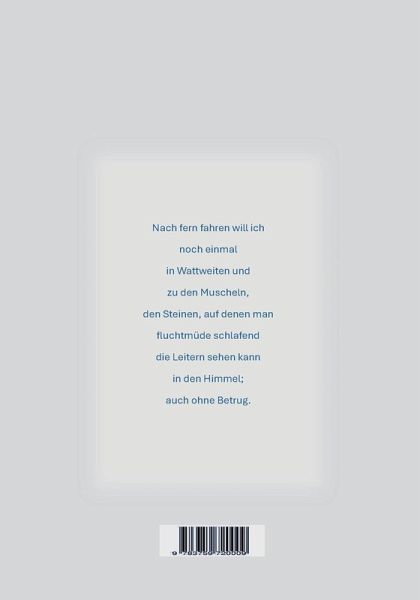 Nach fern fahren will ich noch einmal in Wattweiten und zu den Muscheln, den Steinen, auf denen man fluchtmüde schlafend die Leitern sehen kann in den Himmel; auch ohne Betrug.