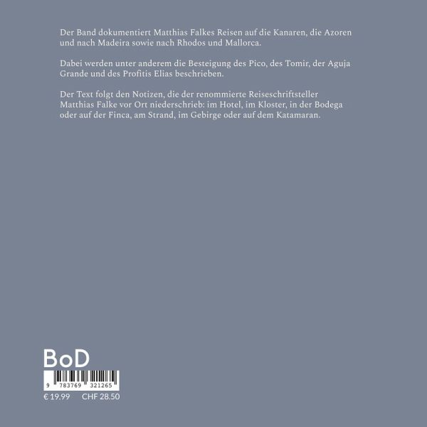 Der Band dokumentiert Matthias Falkes Reisen auf die Kanaren, die Azoren und nach Madeira sowie nach Rhodos und Mallorca. Dabei werden unter anderem die Besteigung des Pico, des Tomir, der Aguja Grande und des Profitis Elias beschrieben. Der Text folgt den Notizen, die der renommierte Reiseschriftsteller Matthias Falke vor Ort niederschrieb: im Hotel, im Kloster, in der Bodega oder auf der Finca, am Strand, im Gebirge oder auf dem Katamaran.