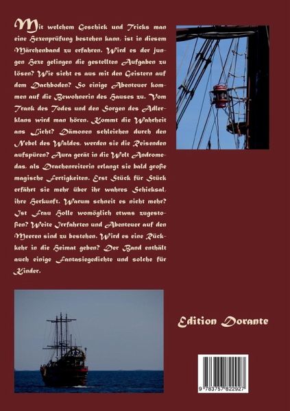 Mit welchem Geschick und Tricks man eine Hexenprüfung bestehen kann, ist in diesem Märchenband zu erfahren. Wird es der jungen Hexe gelingen die gestellten Aufgaben zu lösen? Wie sieht es aus mit den Geistern auf dem Dachboden? So einige Abenteuer kommen auf die Bewohnerin des Hauses zu. Vom Trank des Todes und den Sorgen des Adlerklans wird man hören. Kommt die Wahrheit ans Licht? Dämonen schleichen durch den Nebel des Waldes, werden sie die Reisenden aufspüren? Aura gerät in die Welt Andromedas, als Drachenreiterin erlangt sie bald große magische Fertigkeiten. Erst Stück für Stück erfährt sie mehr über ihr wahres Schicksal, ihre Herkunft. Warum schneit es nicht mehr? Ist Frau Holle womöglich etwas zugestoßen? Weite Irrfahrten und Abenteuer auf den Meeren sind zu bestehen. Wird es eine Rückkehr in die Heimat geben? Der Band enthält auch einige Fantasiegedichte und solche für Kinder.