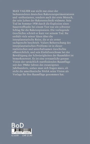 MAX VALIER war nicht nur einer der bedeutendsten deutschen Raketenexperimentatoren und -enthusiasten, sondern auch der erste Mensch, der sein Leben der Raketentechnik widmete. Sein Tod im Sommer 1930 durch die Explosion eines Sauerstofftanks bei einem Test war ein schwerer Schlag für die Raketenpioniere. Die vorliegende Geschichte schrieb er kurz vor seinem Tod. Sie enthält viele seiner Ideen über die interplanetarische Reise, die er als erster sachgerecht beschrieb. Valiers Beherrschung des interplanetarischen Problems ist in dieser realistischen und unterhaltsamen Geschichte offensichtlich, und sein Einfallsreichtum bei der Bewältigung der Schwierigkeiten der Raumfahrt ist bemerkenswert. Es ist eine erstaunliche genaue Vision der tatsächlich stattfindenden Raumflüge seit den 1960er Jahren des zwanzigsten Jahrhunderts, sodass man sich fragen muss, ob nicht die amerikanische NASA seine Vision als Vorlage für ihre Raumflüge genommen hat.