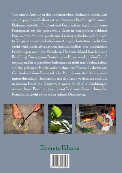 Von einem Ausflug in den indonesischen Dschungel in ein Dorf weitab jeglicher Zivilisation berichtet eine Erzählung. Mit dem Einbaum, reichlich Proviant und Geschenken begibt sich unser Protagonist auf die gefahrvolle Reise in den grünen Schlund. Eine andere Autorin greift eine Liebesgeschichte auf, die sich in Kriegszeiten entwickelt, deren Ausgang betroffen macht. Gesucht wird nach alternativen Schulmodellen, von praktischen Erfahrungen nach der Wende in Ostdeutschland handelt eine Erzählung. Der eigenen Beziehung zu Hüten wird auf den Grund gegangen. Ein mysteriöser Jadedrachen steht zum Verkauf, doch welche geheimen Kräfte wohnen ihm inne? Grüne Gedichte aus Ostfriesland, dem Vessertal oder Haiti lassen sich finden, viele unterschiedliche Themen, die mit der Farbe verbunden sind, die in diesem Band die Hauptrolle spielt. Auch alle Erzählungen weisen diesen Berührungspunkt auf. In einem schwer zu lösenden Kriminalfall geht es um einen grünen Diamanten.