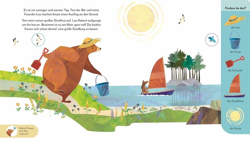 Bär Toni und seine Vogelfreundin Lou machen einen Ausflug ans Meer. Sie beobachten Fische, sammeln Muscheln und helfen einer Schildkröte in Not. Zum Abschluss des schönen Tages legen sie aus ihren gefundenen Schätzen ein Bild in den Sand. Jonny Lambert erzählt eine Geschichte zum Vorlesen über einen tollen Tag am Meer. Gemeinsam mit Toni und Lou lernen Kinder ab 3 Jahren die Tiere und Pflanzen des Meeres kennen. Suchbilder warten darauf, in den bunten Illustrationen gefunden zu werden. Gucklöcker auf jeder Seite sorgen für zusätzlichen Entdeckerspaß. Die gratis Hörversion, die ganz einfach heruntergeladen werden kann, schult spielerisch Sprachgefühl und Konzentrationsfähigkeit. Ein wunderbares Kinderbuch über Freundschaft, das sich hervorragend als Gute Nacht-Geschichte eignet und ein tolles Geschenk für 3-Jährige ist.