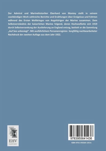 Der Admiral und Marinehistoriker Eberhard von Mantey stellt in seinem zweibändigen Werk zahlreiche Berichte und Erzählungen über Ereignisse und Fahrten während des Ersten Weltkrieges von Angehörigen der Marine zusammen. Dem Selbstverständnis der kaiserlichen Marine folgend, deren Hochseeflotte sich 1919 durch Selbstversenkung der Auslieferung an England entzog, betitelt er die Sammlung Auf See unbesiegt . Mit ausführlichem Personenregister. Sorgfältig nachbearbeiteter Nachdruck der zweiten Auflage aus dem Jahr 1922.