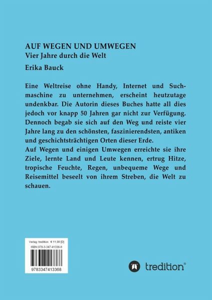 Eine Weltreise ohne Handy, Internet und Suchmaschine zu unternehmen, erscheint heutzutage undenkbar. Die Autorin dieses Buches hatte all dies jedoch vor knapp 50 Jahren gar nicht zur Verfügung. Dennoch begab sie sich auf den Weg und reiste vier Jahre lang zu den schönsten, faszinierendsten, antiken und geschichtsträchtigsten Orten dieser Erde. Auf Wegen und einigen Umwegen erreichte sie ihre Ziele, lernte Land und Leute kennen, ertrug Hitze, tropische Feuchte, Regen, unbequeme Wege und Reisemittel beseelt von ihrem Streben, die Welt zu schauen.