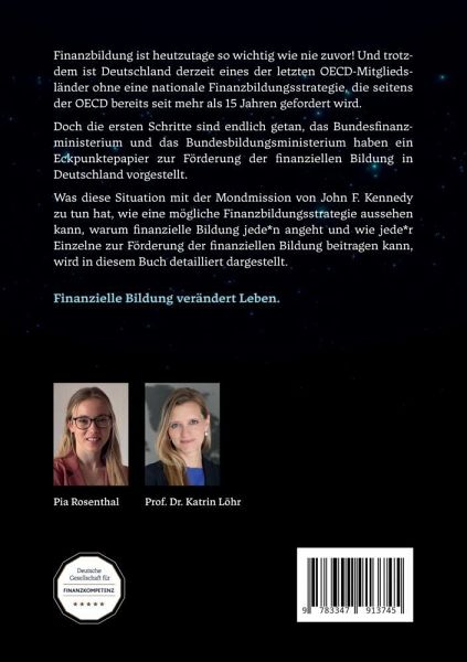 Finanzbildung ist heutzutage so wichtig wie nie zuvor! Und trotzdem ist Deutschland derzeit eines der letzten OECD-Mitgliedsländer ohne eine nationale Finanzbildungsstrategie, die seitens der OECD bereits seit mehr als 15 Jahren gefordert wird.Doch die ersten Schritte sind endlich getan, das Bundesfinanz- ministerium und das Bundesbildungsministerium haben ein Eckpunktepapier zur Förderung der finanziellen Bildung in Deutschland vorgestellt.Was diese Situation mit der Mondmission von John F. Kennedy zu tun hat, wie eine mögliche Finanzbildungsstrategie aussehen kann, warum finanzielle Bildung jede_n angeht und wie jede_r Einzelne zur Förderung der finanziellen Bildung beitragen kann, wird in diesem Buch detailliert dargestellt.