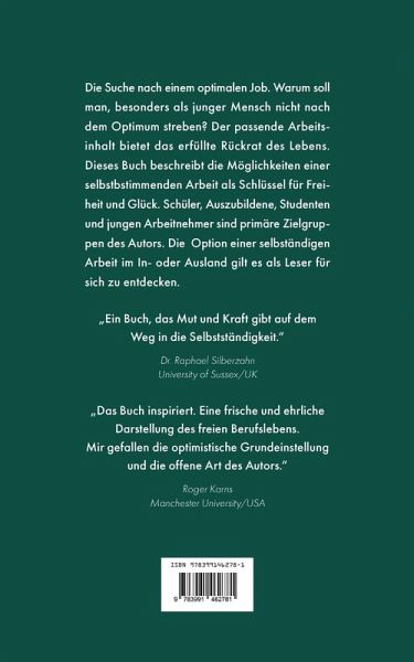 Die Suche nach einem optimalen Job. Warum soll man, besonders als junger Mensch nicht nach dem Optimum streben? Der passende Arbeitsinhalt bietet das erfüllte Rückrat des Lebens.Dieses Buch beschreibt die Möglichkeiten einer selbstbstimmenden Arbeit als Schlüssel für Freiheit und Glück. Schüler, Auszubildene, Studenten und jungen Arbeitnehmer sind primäre Zielgruppen des Autors. Die Option einer selbständigen Arbeit im In- oder Ausland gilt es als Leser für sich zu entdecken."Ein Buch, das Mut und Kraft gibt auf dem Weg in die Selbstständigkeit."Dr. Raphael SilberzahnUniversity of Sussex/UK"Das Buch inspiriert. Eine frische und ehrliche Darstellung des freien Berufslebens. Mir gefallen die optimistische Grundeinstellung und die offene Art des Autors."Roger KarnsManchester University/USA