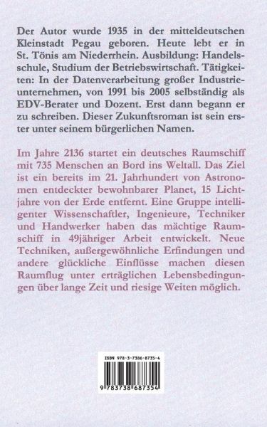 Der Autor wurde 1935 in der mitteldeutschen Kleinstadt Pegau geboren. Heute lebt er in St. Tönis am Niederrhein. Ausbildung: Handelsschule, Studium der Betriebswirtschaft. Tätigkeiten: In der Datenverarbeitung großer Industrieunternehmen, von 1991 bis 2005 selbständig als EDV-Berater und Dozent. Erst dann begann er zu schreiben. Dieser Zukunftsroman ist sein erster unter seinem bürgerlichen Namen.Im Jahre 2136 startet ein deutsches Raumschiff mit 735 Menschen an Bord ins Weltall. Das Ziel ist ein bereits im 21. Jahrhundert von Astronomen entdeckter bewohnbarer Planet, 15 Lichtjahre von der Erde entfernt. Eine Gruppe intelligenter Wissenschaftler, Ingenieure, Techniker und Handwerker haben das mächtige Raumschiff in 49jähriger Arbeit entwickelt. Neue Techniken, außergewöhnliche Erfindungen und andere glückliche Einflüsse machen diesen Raumflug unter erträglichen Lebensbedingungen über lange Zeit und riesige Weiten möglich.