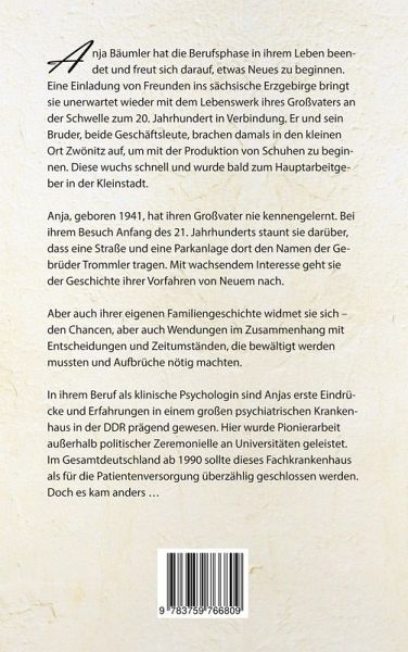 Anja Bäumler hat die Berufsphase in ihrem Leben beendet und freut sich darauf, etwas Neues zu beginnen. Eine Einladung von Freunden ins sächsische Erzgebirge bringt sie unerwartet wieder mit dem Lebenswerk ihres Großvaters an der Schwelle zum 20. Jahrhundert in Verbindung. Er und sein Bruder, beide Geschäftsleute, brachen damals in den kleinen Ort Zwönitz auf, um mit der Produktion von Schuhen zu beginnen. Diese wuchs schnell und wurde bald zum Hauptarbeitgeber in der Kleinstadt. Anja, geboren 1941, hat ihren Großvater nie kennengelernt. Bei ihrem Besuch Anfang des 21. Jahrhunderts staunt sie darüber, dass eine Straße und eine Parkanlage dort den Namen der Gebrüder Trommler tragen. Mit wachsendem Interesse geht sie der Geschichte ihrer Vorfahren von Neuem nach. Aber auch ihrer eigenen Familiengeschichte widmet sie sich - den Chancen, aber auch Wendungen im Zusammenhang mit Entscheidungen und Zeitumständen, die bewältigt werden mussten und Aufbrüche nötig machten. In ihrem Beruf als klinische Psychologin sind Anjas erste Eindrücke und Erfahrungen in einem großen psychiatrischen Krankenhaus in der DDR prägend gewesen. Hier wurde Pionierarbeit außerhalb politischer Zeremonielle an Universitäten geleistet. Im Gesamtdeutschland ab 1990 sollte dieses Fachkrankenhaus als für die Patientenversorgung überzählig geschlossen werden. Doch es kam anders ...
