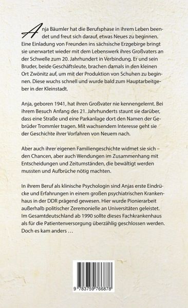 Anja Bäumler hat die Berufsphase in ihrem Leben beendet und freut sich darauf, etwas Neues zu beginnen. Eine Einladung von Freunden ins sächsische Erzgebirge bringt sie unerwartet wieder mit dem Lebenswerk ihres Großvaters an der Schwelle zum 20. Jahrhundert in Verbindung. Er und sein Bruder, beide Geschäftsleute, brachen damals in den kleinen Ort Zwönitz auf, um mit der Produktion von Schuhen zu beginnen. Diese wuchs schnell und wurde bald zum Hauptarbeitgeber in der Kleinstadt. Anja, geboren 1941, hat ihren Großvater nie kennengelernt. Bei ihrem Besuch Anfang des 21. Jahrhunderts staunt sie darüber, dass eine Straße und eine Parkanlage dort den Namen der Gebrüder Trommler tragen. Mit wachsendem Interesse geht sie der Geschichte ihrer Vorfahren von Neuem nach. Aber auch ihrer eigenen Familiengeschichte widmet sie sich - den Chancen, aber auch Wendungen im Zusammenhang mit Entscheidungen und Zeitumständen, die bewältigt werden mussten und Aufbrüche nötig machten. In ihrem Beruf als klinische Psychologin sind Anjas erste Eindrücke und Erfahrungen in einem großen psychiatrischen Krankenhaus in der DDR prägend gewesen. Hier wurde Pionierarbeit außerhalb politischer Zeremonielle an Universitäten geleistet. Im Gesamtdeutschland ab 1990 sollte dieses Fachkrankenhaus als für die Patientenversorgung überzählig geschlossen werden. Doch es kam anders ...