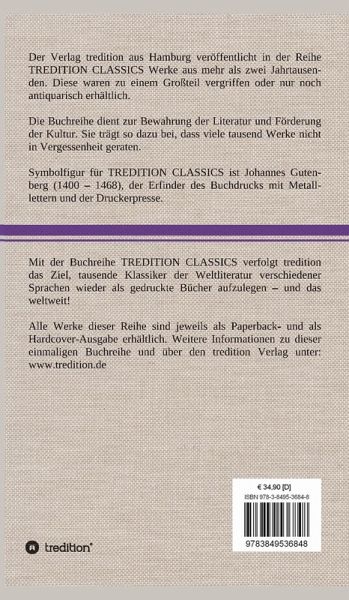 Diese Hardcover-Ausgabe ist Teil der TREDITION CLASSICS. Der Verlag tredition aus Hamburg veröffentlicht in der Buchreihe TREDITION CLASSICS Werke aus mehr als zwei Jahrtausenden. Diese waren zu einem Großteil vergriffen oder nur noch antiquarisch erhältlich. Mit TREDITION CLASSICS verfolgt tredition das Ziel, tausende Klassiker der Weltliteratur verschiedener Sprachen wieder als gedruckte Bücher zu verlegen und das weltweit! Die Buchreihe dient zur Bewahrung der Literatur und Förderung der Kultur. Sie trägt so dazu bei, dass viele tausend Werke nicht in Vergessenheit geraten.