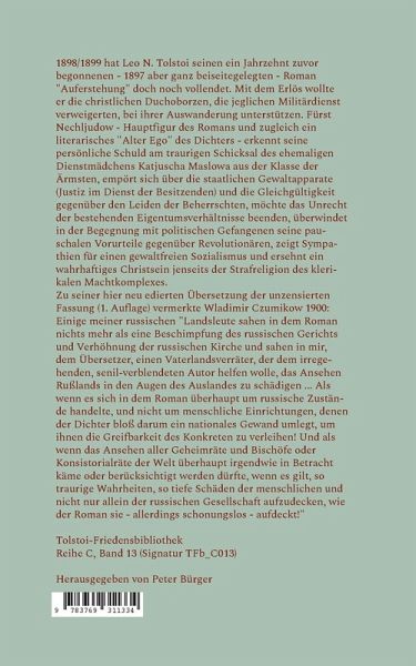 1898/1899 hat Leo N. Tolstoi seinen ein Jahrzehnt zuvor begonnenen - 1897 aber ganz beiseitegelegten - Roman "Auferstehung" doch noch vollendet. Mit dem Erlös wollte er die christlichen Duchoborzen, die jeglichen Militärdienst verweigerten, bei ihrer Auswanderung unterstützen. Fürst Nechljudow - Hauptfigur des Romans und zugleich ein literarisches "Alter Ego" des Dichters - erkennt seine persönliche Schuld am traurigen Schicksal des ehemaligen Dienstmädchens Katjuscha Maslowa aus der Klasse der Ärmsten, empört sich über die staatlichen Gewaltapparate (Justiz im Dienst der Besitzenden) und die Gleichgültigkeit gegenüber den Leiden der Beherrschten, möchte das Unrecht der bestehenden Eigentumsverhältnisse beenden, überwindet in der Begegnung mit politischen Gefangenen seine pauschalen Vorurteile gegenüber Revolutionären, zeigt Sympathien für einen gewaltfreien Sozialismus und ersehnt ein wahrhaftiges Christsein jenseits der Strafreligion des klerikalen Machtkomplexes. Zu seiner hier neu edierten Übersetzung der unzensierten Fassung (1. Auflage) vermerkte Wladimir Czumikow 1900: Einige meiner russischen "Landsleute sahen in dem Roman nichts mehr als eine Beschimpfung des russischen Gerichts und Verhöhnung der russischen Kirche und sahen in mir, dem Übersetzer, einen Vaterlandsverräter, der dem irregehenden, senil-verblendeten Autor helfen wolle, das Ansehen Rußlands in den Augen des Auslandes zu schädigen ... Als wenn es sich in dem Roman überhaupt um russische Zustände handelte, und nicht um menschliche Einrichtungen, denen der Dichter bloß darum ein nationales Gewand umlegt, um ihnen die Greifbarkeit des Konkreten zu verleihen! Und als wenn das Ansehen aller Geheimräte und Bischöfe oder Konsistorialräte der Welt überhaupt irgendwie in Betracht käme oder berücksichtigt werden dürfte, wenn es gilt, so traurige Wahrheiten, so tiefe Schäden der menschlichen und nicht nur allein der russischen Gesellschaft aufzudecken, wie der Roman sie - allerdings schonungslos - aufdeckt!" Tolstoi-Friedensbibliothek: Reihe C, Band 13 (Signatur TFb_C013). Herausgegeben von Peter Bürger.