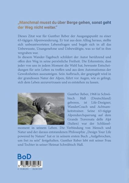 "Manchmal musst du über Berge gehen, sonst geht der Weg nicht weiter." Ein Zitat, das Gunther Reber auf die Reise geschickt hat, um auf einer 63-tägigen Alpenwanderung seine eigenen Berge zu durchqueren.Er trat aus dem Alltag heraus, stellte sich den unbeantworteten Lebensfragen und begab sich in das Unbewusste, Unangenehme und Unbewältigte, was so tief in ihm vergraben war.Mit seiner berührenden und offenen Art beschreibt er detailliert den Weg in seine persönliche Freiheit. Eine Freiheit, die ihm eine Wahl ermöglicht in jedem Moment bewusste Entscheidungen für sein Leben zu treffen und aus dem Automatismus der Gewohnheit auszusteigen. Ein Aufbruch den ihm die Natur spiegelt - sich dem Leben anzuvertrauen und es entstehen zu lassen.