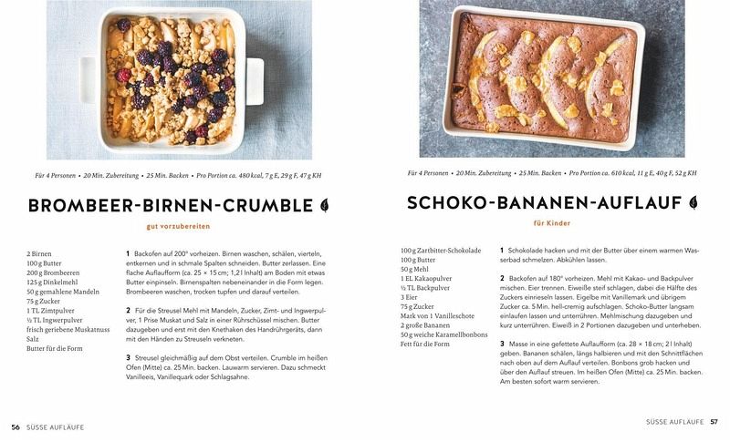 Im Rezeptteil finden Sie Rezepte für Aufläufe nach jedem Geschmack. Wie wäre es mit Gyrosauflauf oder einem Filo-Hackfleisch-Gratin? Oder möchten Sie lieber einnm vegetarischen Auflauf wie dem Zucchini-Auflauf alla Parmigiana oder dem Pilz-Auflauf mit Rösti-Kruste? Aber auch der süße Abschluss darf aus der Form kommen: Mit Brombeer-Birnen-Crumble und Kokos-Reisauflauf mit Mango ist für Schleckermäulchen gesorgt.