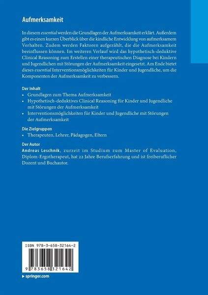 In diesem essential werden die Grundlagen der Aufmerksamkeit erklärt. Außerdem gibt es einen kurzen Überblick über die kindliche Entwicklung von aufmerksamem Verhalten. Zudem werden Faktoren aufgezählt, die die Aufmerksamkeit beeinflussen können. Im weiteren Verlauf wird das hypothetisch-deduktive Clinical Reasoning zum Erstellen einer therapeutischen Diagnose bei Kindern und Jugendlichen mit Störungen der Aufmerksamkeit eingesetzt. Am Ende bietet dieses essential Interventionsmöglichkeiten für Kinder und Jugendliche, um die Komponenten der Aufmerksamkeit zu verbessern.