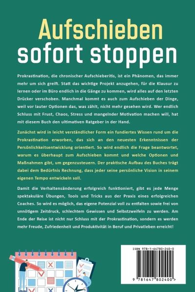Kommt es dir bekannt vor: Du musst ein wichtiges Projekt für deinen Chef abschließen oder diese Präsentation vorbereiten. Vielleicht musst du auch einfach nur die Wäsche bügeln oder deine Unterlagen für die Steuererklärung zusammensuchen. Drei Stunden später ist immer noch nichts erledigt und du schaust dir lustige Katzenvideos im Internet an. Warum heute die Aufgabe erledigen? Morgen ist schließlich auch noch ein Tag und heute ist es sowieso schon zu spät. Aber warum verschiebst du Dinge, die du eigentlich tun wolltest? Laut Psychologen versuchen Betroffene, durch das Aufschieben negative Emotionen zu verdrängen. Sind ungute Gefühle mit einer Aufgabe verbunden, werden automatisch Dinge unternommen, die leicht sind oder einfach mehr Spaß machen. Studien fanden heraus, dass dieses Verschieben die negativen Emotionen nicht beseitigt. Im Gegenteil. Prokrastinieren sorgt für unnötigen Stress, da sich Angst und Schuldgefühle durch den Zeitdruck, der beim Aufschieben entsteht, verstärken. Dieser Verstärker führt am Ende dazu, noch mehr Dinge auf die lange Bank zu schieben. Ein Teufelskreis. Doch wie wäre es, wenn du dir in Zukunft viel hausgemachten Stress ersparen könntest, indem du eine effektive Methode erlernst, die dich an den wichtigen Dingen dranbleiben lässt? Der Autor Patrick Drechsler litt einst selbst an chronischer Aufschieberitis. Bis er den Hebel umlegte und sein Mindset erfolgreich neu programmierte. Seitdem hat er unzähligen Menschen auf die Gewinnerstrasse verholfen. Wenn du den entscheidenden Schritt nach vorne machen willst, dann wird dieses Buch deinen Nerv treffen!Chronische Aufschieberitis kann ganz verschiedene Ursachen haben. Einige davon sind typisch, andere eher selten. Welche Ursache hat das Aufschieben bei dir? Komme mit diesem Buch dem Phänomen des Aufschiebens detailliert auf die Spur. Aufschieben kann durchaus sinnvoll sein. Lese im Buch, wie du mit positiv genutzter Prokrastination erkennst, ob sich ein Aufwand tatsächlich für dich lohnt. Gehe deiner Lust am Aufschieben auf den Grund und erhalte Methoden und Aufgaben, die es dir ermöglichen, endlich ehrlich mit dir selbst zu sein! Dieses Buch ist in Modulen aufgebaut und folgt damit den neuesten Erkenntnissen der Hirnforschung. So werden "Teachable Moments" geschaffen. Damit sind lehrreiche Momente gemeint, die dich wirklich nach vorne bringen! Profitiere von zahlreichen Selbsttests und Aufgaben, die sich deiner individuellen Situation anpassen. Dieses Buch ist kein Ratgeber von der Stange, sondern ein Leitfaden, mit dem du passgenaue Lösungen und Strategien für dein Anliegen findest. Die chronische Aufschieberitis endlich in den Griff bekommen: Entwickele mit diesem Buch mehr Selbstüberzeugung, mehr Selbstkontrolle und beobachte nahezu magische Effekte. Denn sobald du eine Sache änderst, wird sich deine Sicht auf die Welt, aber auch dein Umfeld verändern! Setze einen gezielten Kontrapunkt zu hektischen Aktivitäten und kultiviere die Kunst der Entschleunigung - dieses Buch stellt dir hervorragende Konzepte für mehr Achtsamkeit vor, die dir langfristig helfen, in deinem Leben Prioritäten zu setzen. Aufgeschoben ist nicht aufgehoben? Von wegen! Mache jetzt den Schritt in ein erfolgreiches und selbstbestimmtes Leben! Bekomme mit diesem Buch deinen inneren Schweinehund nachhaltig in den Griff und befreie dich von der chronischen Aufschieberitis!