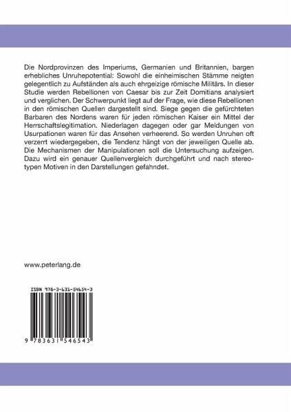 Die Nordprovinzen des Imperiums, Germanien und Britannien, bargen erhebliches Unruhepotential: Sowohl die einheimischen Stämme neigten gelegentlich zu Aufständen als auch ehrgeizige römische Militärs. In dieser Studie werden Rebellionen von Caesar bis zur Zeit Domitians analysiert und verglichen. Der Schwerpunkt liegt auf der Frage, wie diese Rebellionen in den römischen Quellen dargestellt sind. Siege gegen die gefürchteten Barbaren des Nordens waren für jeden römischen Kaiser ein Mittel der Herrschaftslegitimation. Niederlagen dagegen oder gar Meldungen von Usurpationen waren für das Ansehen verheerend. So werden Unruhen oft verzerrt wiedergegeben, die Tendenz hängt von der jeweiligen Quelle ab. Die Mechanismen der Manipulationen soll die Untersuchung aufzeigen. Dazu wird ein genauer Quellenvergleich durchgeführt und nach stereotypen Motiven in den Darstellungen gefahndet.