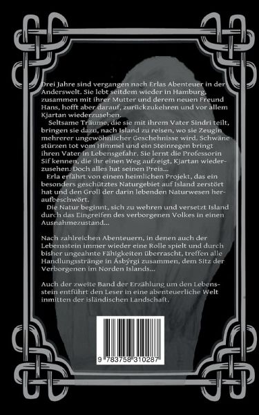 Drei Jahre sind vergangen nach Erlas Abenteuer in der Anderswelt. Sie lebt seitdem wieder in Hamburg, zusammen mit ihrer Mutter und derem neuen Freund Hans, hofft aber darauf, zurückzukehren und vor allem Kjartan wiederzusehen. Seltsame Träume, die sie mit ihrem Vater Sindri teilt, bringen sie dazu, nach Island zu reisen, wo sie Zeugin mehrerer ungewöhnlicher Geschehnisse wird. Schwäne stürzen tot vom Himmel und ein Steinregen bringt ihren Vater in Lebensgefahr. Sie lernt die Professorin Sif kennen, die ihr einen Weg aufzeigt, Kjartan wiederzusehen. Doch alles hat seinen Preis... Erla erfährt von einem heimlichen Projekt, das ein besonders geschütztes Naturgebiet auf Island zerstört hat und den Groll der darin lebenden Naturwesen heraufbeschwört. Die Natur beginnt, sich zu wehren und versetzt Island durch das Eingreifen des verborgenen Volkes in einen Ausnahmezustand...Nach zahlreichen Abenteuern, in denen auch der Lebensstein immer wieder eine Rolle spielt und durch bisher ungeahnte Fähigkeiten überrascht, treffen alle Handlungsstränge in Ásbýrgi zusammen, dem Sitz der Verborgenen im Norden Islands...Auch der zweite Band der Erzählung um den Lebensstein entführt den Leser in eine abenteuerliche Welt inmitten der isländischen Landschaft.