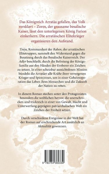 Das Königreich Arratäa gefallen, das Volk versklavt - Zoros, der grausame besalische Kaiser, lässt den unterlegenen König Farion einkerkern. Die arratäischen Elitekrieger organisieren den Aufstand.Treju, Kommandant der Raben, der arratäischen Elitetruppen, sammelt den Widerstand gegen die Besatzung durch das Besalische Kaiserreich. Der Adler beschließt, durch die Befreiung der Königsfamilie aus den Händen der Eroberer ein Zeichen zu setzen. In einer scheinbar aussichtslosen Mission bündeln die Arratäer alle Kräfte ihrer verwegenen Krieger und Spioninnen, um in einer Geheimoperation das Leben ihres Monarchen und die Zukunft der Nation zu retten.In diesem Roman stechen unter den Protagonisten besonders die weiblichen hervor, die unerschrocken und trickreich in einer von Gewalt, Macht und Unterwerfung geprägten patriarchalischen Welt ein Zeichen der Freiheit setzen. Durch verschiedene Ereignisse in der Welt hat der Roman auf erschreckende Art zusätzlich an Aktualität gewonnen.