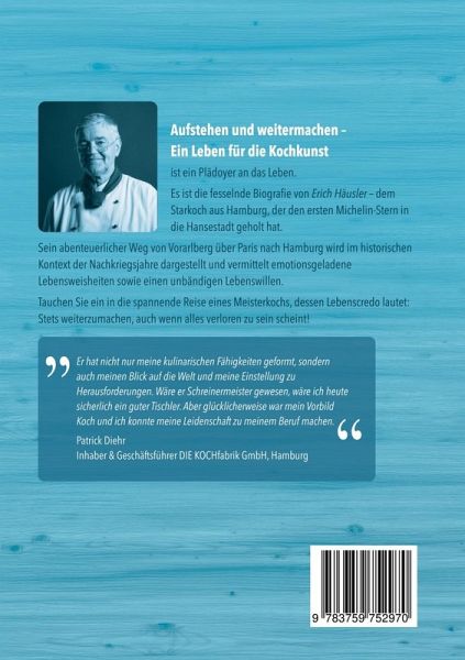 «Aufstehen und Weitermachen. Ein Leben für die Kochkunst» ist ein Plädoyer an das Leben. Es ist eine fesselnde Biografie von Erich Häusler (geb. 1946) - dem Starkoch aus Hamburg, der den ersten Michelin-Stern in die Hansestadt geholt hatte. Sein abenteuerlicher Weg von Vorarlberg über Paris nach Hamburg wird im historischen Kontext der Nachkriegsjahre dargestellt und vermittelt emotionsgeladene Lebensweisheiten sowie einen unbändigen Lebenswillen. Angesichts der vielfältigen Herausforderungen im privaten, beruflichen Umfeld und der geopolitischen Entwicklung in Europa und der Welt ist diese Schlüsselkompetenz heute besonders aktuell.Tauchen Sie ein in die spannungsgeladene Reise eines Meisterkochs mit seinem Lebenscredo: «Stets weiterzumachen, auch wenn alles verloren zu sein scheint!»