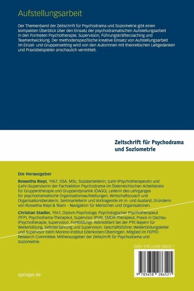 Riepl, Roswitha, 1967, DSA, MSc, Sozialarbeiterin, (Lehr-)Psychotherapeutin und (Lehr-)Supervisorin der Fachsektion Psychodrama im Österreichischen Arbeitskreis für Gruppentherapie und Gruppendynamik (ÖAGG), Leiterin des Lehrganges für psychodramatische Organisationsaufstellungen, Wirtschaftscoach und Organisationsberaterin, Seminarleiterin und Vortragende im In- und Ausland, Gründerin von Roswitha Riepl & Team - Navigation für Menschen und Organisationen. Christian Stadler, 1961, Diplom-Psychologe, Psychologischer Psychotherapeut (TFP), Psychodrama-Therapeut, Supervisor (PSR), EMDR-Therapeut, Praxis in Dachau (Psychotherapie, Supervision, Fortbildung). Akkreditiert bei der PTK Bayern für Weiterbildung, Selbsterfahrung und Supervision. Geschäftsführer, Weiterbildungsleiter und Supervisor beim Moreno-Institut Edenkoben/Überlingen. Mitglied im FEPTO Research Committee. Mitherausgeber der Zeitschrift für Psychodrama und Soziometrie.