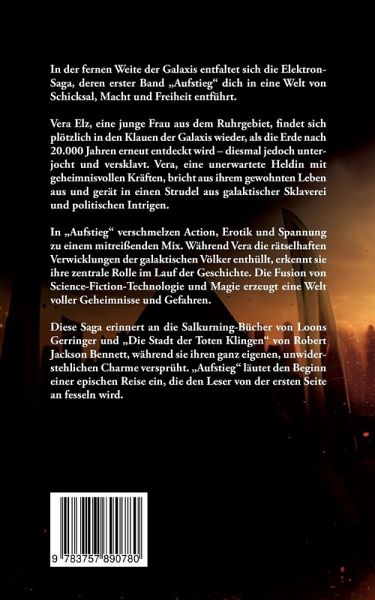 In der fernen Weite der Galaxis entfaltet sich die Elektron-Saga, deren erster Band "Aufstieg" dich in eine Welt von Schicksal, Macht und Freiheit entführt.Vera Elz, eine junge Frau aus dem Ruhrgebiet, findet sich plötzlich in den Klauen der Galaxis wieder, als die Erde nach 20.000 Jahren erneut entdeckt wird - diesmal jedoch unterjocht und versklavt. Vera, eine unerwartete Heldin mit geheimnisvollen Kräften, bricht aus ihrem gewohnten Leben aus und gerät in einen Strudel aus galaktischer Sklaverei und politischen Intrigen.In "Aufstieg" verschmelzen Action, Erotik und Spannung zu einem mitreißenden Mix. Während Vera die rätselhaften Verwicklungen der galaktischen Völker enthüllt, erkennt sie ihre zentrale Rolle im Lauf der Geschichte. Die Fusion von Science-Fiction-Technologie und Magie erzeugt eine Welt voller Geheimnisse und Gefahren. Diese Saga erinnert an die Salkurning-Bücher von Loons Gerringer und "Die Stadt der Toten Klingen" von Robert Jackson Bennett, während sie ihren ganz eigenen, unwiderstehlichen Charme versprüht. "Aufstieg" läutet den Beginn einer epischen Reise ein, die den Leser von der ersten Seite an fesseln wird.