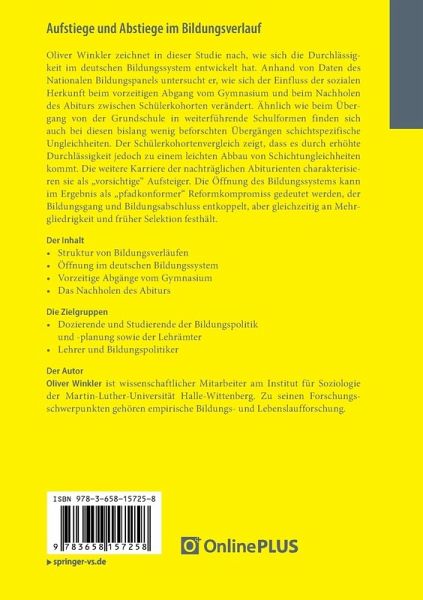 Oliver Winkler zeichnet in dieser Studie nach, wie sich die Durchlässigkeit im deutschen Bildungssystem entwickelt hat. Anhand von Daten des Nationalen Bildungspanels untersucht er, wie sich der Einfluss der sozialen Herkunft beim vorzeitigen Abgang vom Gymnasium und beim Nachholen des Abiturs zwischen Schülerkohorten verändert. Ähnlich wie beim Übergang von der Grundschule in weiterführende Schulformen finden sich auch bei diesen bislang wenig beforschten Übergängen schichtspezifische Ungleichheiten. Der Schülerkohortenvergleich zeigt, dass es durch erhöhte Durchlässigkeit jedoch zu einem leichten Abbau von Schichtungleichheiten kommt. Die weitere Karriere der nachträglichen Abiturienten charakterisieren sie als "vorsichtige" Aufsteiger. Die Öffnung des Bildungssystems kann im Ergebnis als "pfadkonformer" Reformkompromiss gedeutet werden, der Bildungsgang und Bildungsabschluss entkoppelt, aber gleichzeitig an Mehrgliedrigkeit und früher Selektion festhält.