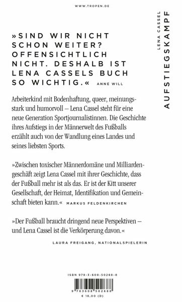 »Zwischen toxischer Männerdomäne und Milliardengeschäft zeigt Lena Cassel mit ihrer Geschichte, dass der Fußball mehr ist als das. Er ist der Kitt unsere Gesellschaft, der Heimat, Identifikation und Gemeinschaft bieten kann.« Markus Feldenkirchen
