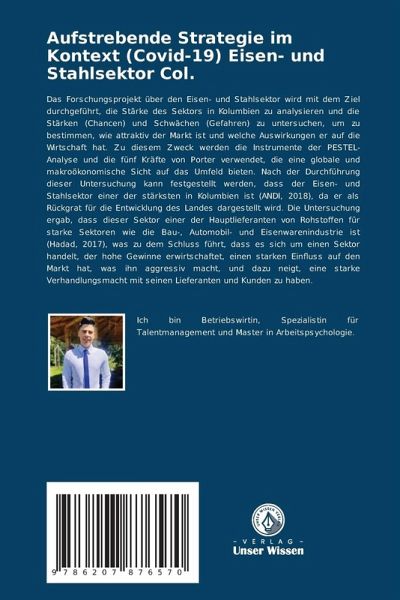 Das Forschungsprojekt über den Eisen- und Stahlsektor wird mit dem Ziel durchgeführt, die Stärke des Sektors in Kolumbien zu analysieren und die Stärken (Chancen) und Schwächen (Gefahren) zu untersuchen, um zu bestimmen, wie attraktiv der Markt ist und welche Auswirkungen er auf die Wirtschaft hat. Zu diesem Zweck werden die Instrumente der PESTEL-Analyse und die fünf Kräfte von Porter verwendet, die eine globale und makroökonomische Sicht auf das Umfeld bieten. Nach der Durchführung dieser Untersuchung kann festgestellt werden, dass der Eisen- und Stahlsektor einer der stärksten in Kolumbien ist (ANDI, 2018), da er als Rückgrat für die Entwicklung des Landes dargestellt wird. Die Untersuchung ergab, dass dieser Sektor einer der Hauptlieferanten von Rohstoffen für starke Sektoren wie die Bau-, Automobil- und Eisenwarenindustrie ist (Hadad, 2017), was zu dem Schluss führt, dass es sich um einen Sektor handelt, der hohe Gewinne erwirtschaftet, einen starken Einfluss auf den Markt hat, was ihn aggressiv macht, und dazu neigt, eine starke Verhandlungsmacht mit seinen Lieferanten und Kunden zu haben.