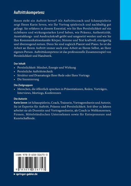 Ihnen steht ein Auftritt bevor? Als Auftrittscoach und Schauspielerin zeigt Ihnen Karin Seven, wie Ihr Vortrag spielerisch und nachhaltig gut gelingt. Sie erfahren in diesem Essential, wie Sie Ihre Persönlichkeit auf ein sichtbares und wirkungsstarkes Level heben, wie Präsenz, Authentizität, Ausstrahlungs- und Ausdruckskraft geübt und umgesetzt werden und wie Sie Ihre Kommunikationskanäle Körper, Stimme und Text kraftvoll, einzigartig und überzeugend nutzen. Denn Sie sind zugleich Pianist und Piano. So ist die Arbeit an Ihrem Auftritt immer auch eine Arbeit an Ihrem Selbst, an Ihrer eigenen Person. Auftrittskompetenz ist das professionelle Zusammenspiel von Persönlichkeit und Handwerk.