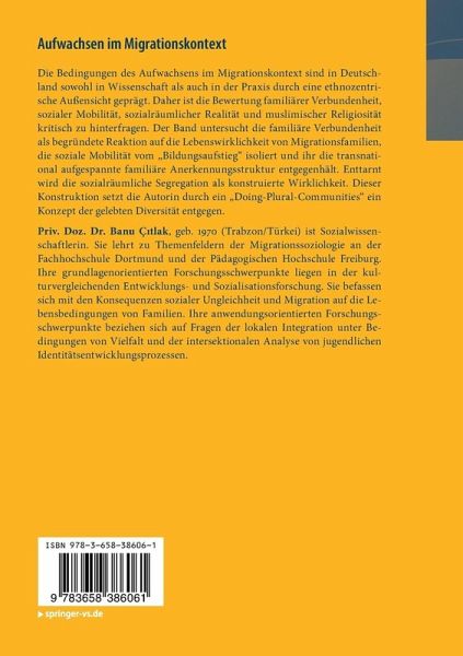 Die Bedingungen des Aufwachsens im Migrationskontext sind in Deutschland sowohl in Wissenschaft als auch in der Praxis durch eine ethnozentrische Außensicht geprägt. Daher ist die Bewertung familiärer Verbundenheit, sozialer Mobilität, sozialräumlicher Realität und muslimischer Religiosität kritisch zu hinterfragen. Der Band untersucht die familiäre Verbundenheit als begründete Reaktion auf die Lebenswirklichkeit von Migrationsfamilien, die soziale Mobilität vom "Bildungsaufstieg" isoliert und ihr die transnational aufgespannte familiäre Anerkennungsstruktur entgegenhält. Enttarnt wird die sozialräumliche Segregation als konstruierte Wirklichkeit. Dieser Konstruktion setzt die Autorin durch ein "Doing-Plural-Communities" ein Konzept der gelebten Diversität entgegen.
