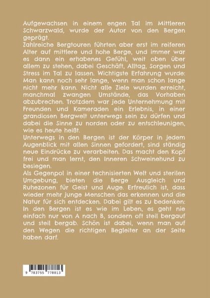 Aufgewachsen in einem engen Tal im Mittleren Schwarzwald, wurde der Autor von den Bergen geprägt.Zahlreiche Bergtouren führten aber erst im reiferen Alter auf mittlere und hohe Berge, und immer war es dann ein erhabenes Gefühl, weit oben über allem zu stehen, dabei Geschäft, Alltag, Sorgen und Stress im Tal zu lassen. Wichtigste Erfahrung wurde: Man kann noch sehr lange, wenn man schon lange nicht mehr kann.Nicht alle Ziele wurden erreicht, manchmal zwangen Umstände, das Vorhaben abzubrechen. Trotzdem war jede Unternehmung mit Freunden und Kameraden ein Erlebnis, in einer grandiosen Bergwelt unterwegs sein zu dürfen und dabei die Sinne zu norden oder zu entschleunigen, wie es heute heißt.Unterwegs in den Bergen ist der Körper in jedem Augenblick mit allen Sinnen gefordert, sind ständig neue Eindrücke zu verarbeiten. Das macht den Kopf frei und man lernt, den Inneren Schweinehund zu besiegen. Als Gegenpol in einer technisierten Welt und sterilen Umgebung, bieten die Berge Ausgleich und Ruhezonen für Geist und Auge. Erfreulich ist, dass wieder mehr junge Menschen das erkennen und die Natur für sich entdecken.Dabei gilt es zu bedenken: In den Bergen ist es wie im Leben, es geht nie einfach nur von A nach B, sondern oft steil bergauf und steil bergab. Schön ist dabei, wenn man auf den Wegen die richtigen Begleiter an der Seite haben darf.