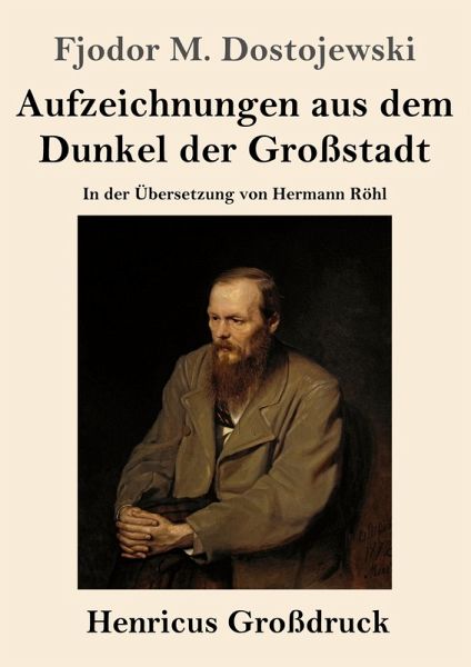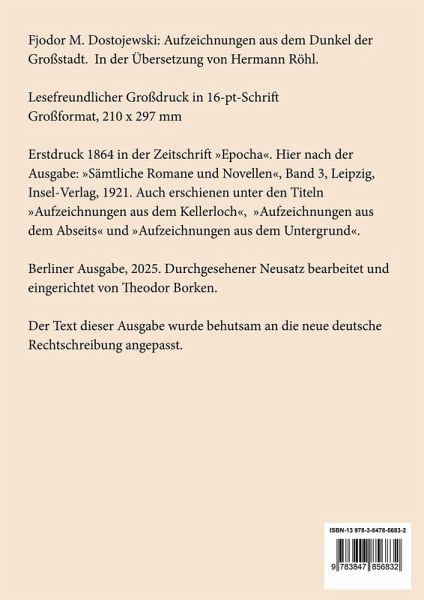 Fjodor M. Dostojewski: Aufzeichnungen aus dem Dunkel der Großstadt. In der Übersetzung von Hermann Röhl Lesefreundlicher Großdruck in 16-pt-Schrift Großformat, 210 x 297 mm Berliner Ausgabe, 2025 Durchgesehener Neusatz bearbeitet und eingerichtet von Theodor Borken Erstdruck 1864 in der Zeitschrift »Epocha«. Hier nach der Ausgabe: »Sämtliche Romane und Novellen«, Band 3, Leipzig, Insel-Verlag, 1921. Auch erschienen unter den Titeln »Aufzeichnungen aus dem Kellerloch«, »Aufzeichnungen aus dem Abseits« und »Aufzeichnungen aus dem Untergrund«. Der Text dieser Ausgabe wurde behutsam an die neue deutsche Rechtschreibung angepasst. Gesetzt aus der Minion Pro, 16 pt. Henricus - Edition Deutsche Klassik GmbH