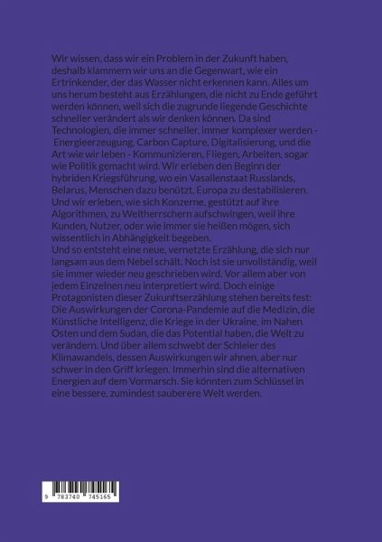 Wir wissen, dass wir ein Problem in der Zukunft haben, deshalb klammern wir uns an die Gegenwart, wie ein Ertrinkender, der das Wasser nicht erkennen kann. Alles um uns herum besteht aus Erzählungen, die nicht zu Ende geführt werden können, weil sich die zugrunde liegende Geschichte schneller verändert als wir denken können. Da sind Technologien, die immer schneller, immer komplexer werden - Energieerzeugung, Carbon Capture, Digitalisierung, und die Art wie wir leben - Kommunizieren, Fliegen, Arbeiten, sogar wie Politik gemacht wird. Wir erleben den Beginn der hybriden Kriegsführung, wo ein Vasallenstaat Russlands, Belarus, Menschen dazu benützt, Europa zu destabilisieren. Und wir erleben, wie sich Konzerne, gestützt auf ihre Algorithmen, zu Weltherrschern aufschwingen, weil ihre Kunden, Nutzer, oder wie immer sie heißen mögen, sich wissentlich in Abhängigkeit begeben. Und so entsteht eine neue, vernetzte Erzählung, die sich nur langsam aus dem Nebel schält. Noch ist sie unvollständig, weil sie immer wieder neu geschrieben wird. Vor allem aber von jedem Einzelnen neu interpretiert wird. Doch einige Protagonisten dieser Zukunftserzählung stehen bereits fest: Die Auswirkungen der Corona-Pandemie auf die Medizin, die Künstliche Intelligenz, die Kriege in der Ukraine, im Nahen Osten und dem Sudan, die das Potential haben, die Welt zu verändern. Und über allem schwebt der Schleier des Klimawandels, dessen Auswirkungen wir ahnen, aber nur schwer in den Griff kriegen. Immerhin sind die alternativen Energien auf dem Vormarsch. Sie könnten zum Schlüssel in eine bessere, zumindest sauberere Welt werden.
